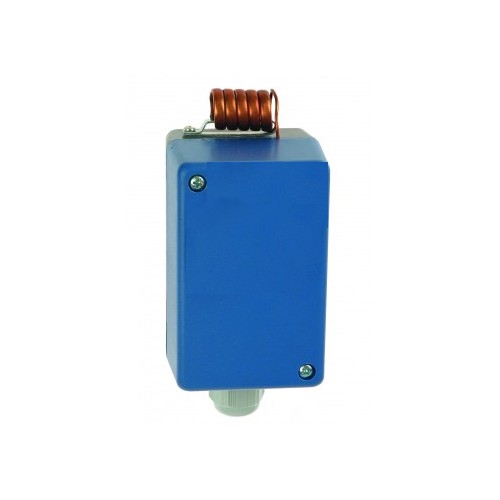 Termostato ON/OFF per ambienti industriali o per esterno, adatto per installazione a muro, scala -30...+30 °C, manopola interna, 1 stadio, differenziale nello stadio 1...5 K, elemento sensibile in rame a riempimento di liquido, tipo di contatto elettrico SPDT, portata contatto 15 (8) A 24...250 Vca, grado di protezione IP 65, massima temperatura bulbo + 65 °C.