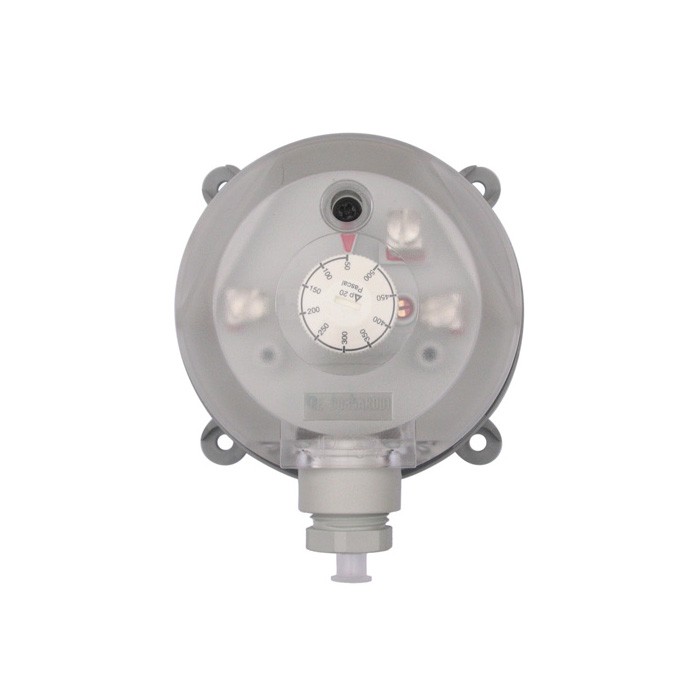 Pressostato differenziale per aria o per gas non-combustibili e non-aggressivi, principalmente usato nei canali d'aria, range di misura 1000...5000 Pa, uscita On / Off, particolarmente adatto nei sistemi di condizionamento dell'aria per fornire l'indicazione dello stato di un ventilatore o di un filtro intasato, valore della pressione di intervento impostabile manualmente con l'uso di un cacciavite operando su un potenziometro munito di scala situato sotto il coperchio, temperatura di utilizzo da -40 °C a +85 °C, due tubi di connessione in plastica, protezione IP54.