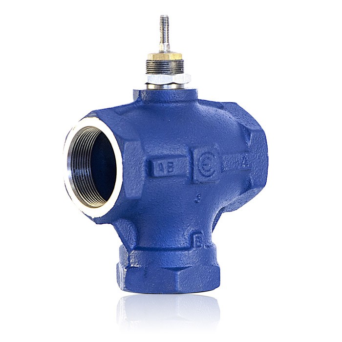 Valvola a globo a tre vie, DN50 PN16 KVS= 30, per acqua o acqua glicolata con miscela sino al 50%, corpo in ghisa GG-25 con attacchi filettati interni, parti interne in ottone, caratteristica di regolazione porta A-AB logaritmica, caratteristica di regolazione porta B-AB lineare, perdita di tenuta porta A-AB < massimo 0.03 % del Kvs, perdita di tenuta porta B-AB < 1% del Kvs, limiti di temperatura fluido -10 / +150 °C.